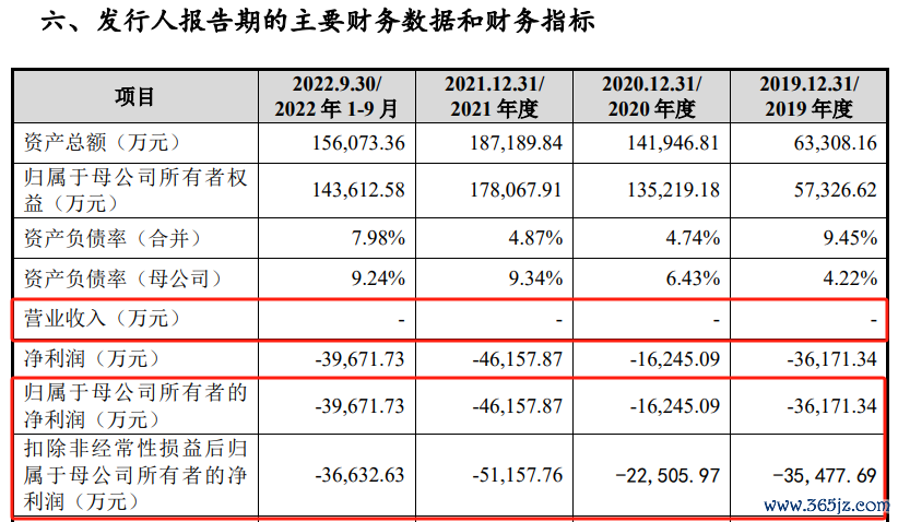 轩竹生物2019年、2020年、2021年、2022年前三季度的营业收入均为0,归母净利润分别亏损3.62亿元、1.62亿元、4.62亿和3.97亿元。