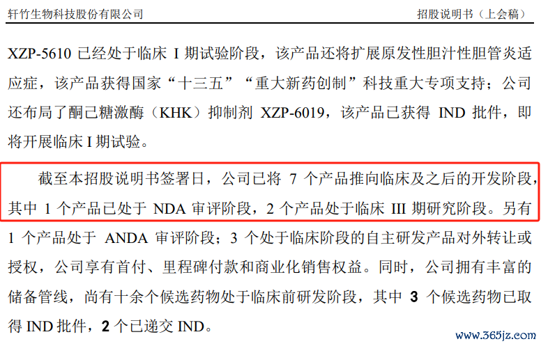 截至招股书(上会稿)披露,轩竹生物已将7个产品推向临床及之后的开发阶段。其中,1个产品处于NDA(新药上市申请)审评阶段;2个产品处于临床III期研究阶段;另有1个产品处于ANDA(仿制药申请)审评阶段;3个处于临床阶段的自主研发产品对外转让或授权。