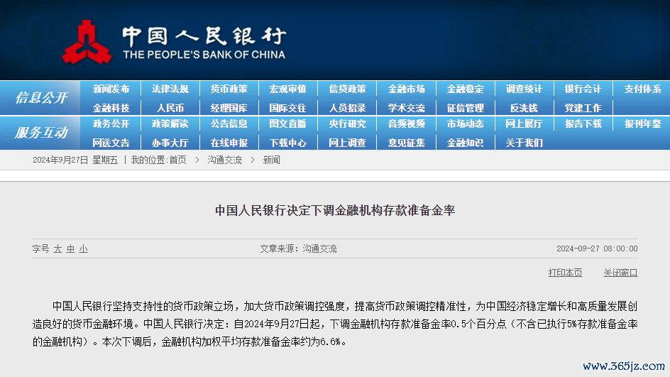 中国人民银行坚持支持性的货币政策立场,加大货币政策调控强度,提高货币政策调控精准性,为中国经济稳定增长和高质量发展创造良好的货币金融环境。中国人民银行决定:自2024年9月27日起,下调金融机构存款准备金率0.5个百分点(不含已执行5%存款准备金率的金融机构)。本次下调后,金融机构加权平均存款准备金率约为6.6%。