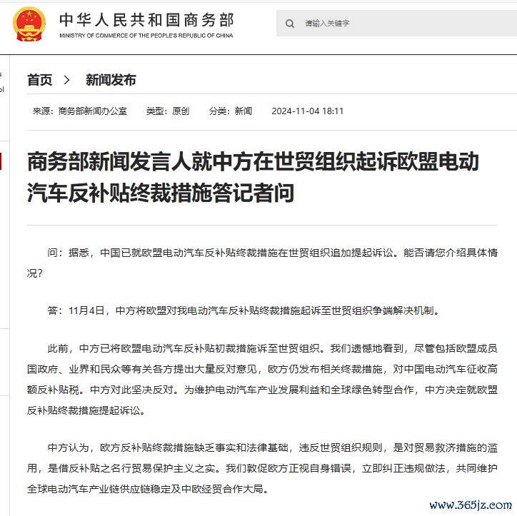 商务部新闻发言人就中方在世贸组织起诉欧盟电动汽车反补贴终裁措施答记者问