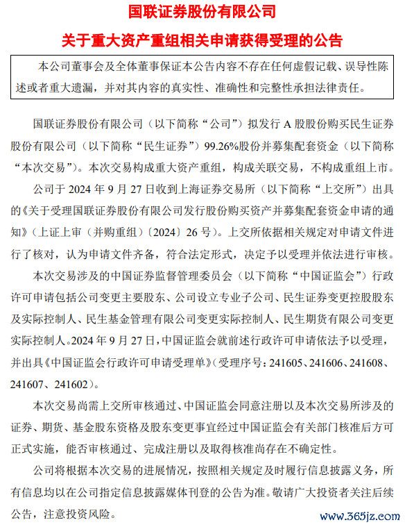 公司于2024年9月27日收到上交所出具的《关于受理国联证券股份有限公司发行股份购买资产并募集配套资金申请的通知》。上交所依据相关规定对申请文件进行了核对,认为申请文件齐备,符合法定形式,决定予以受理并依法进行审核。